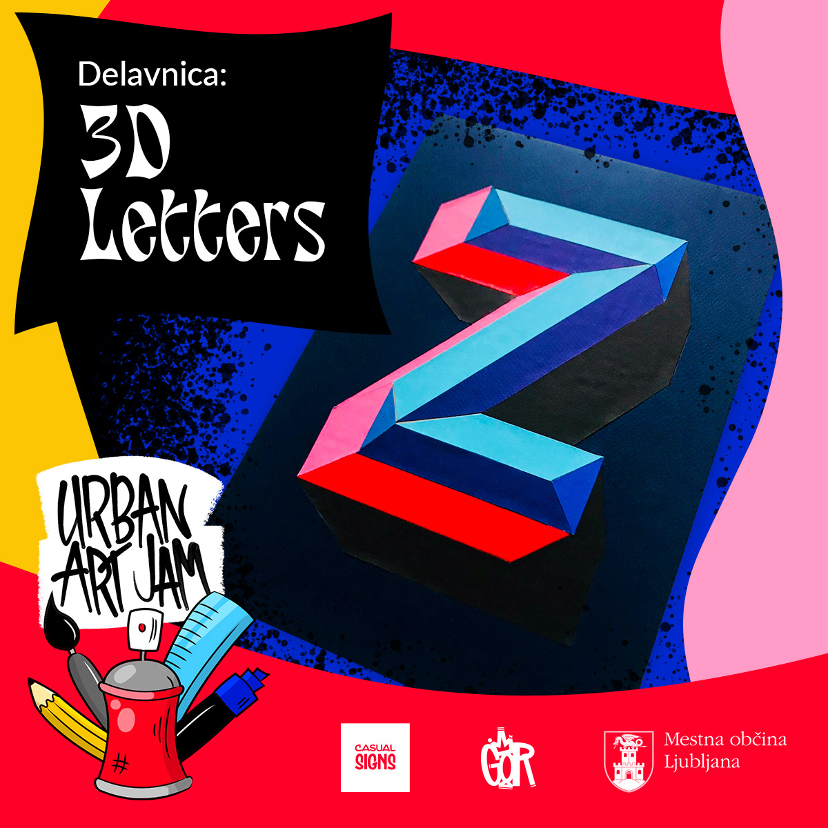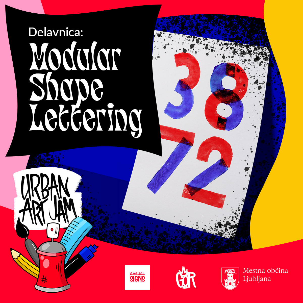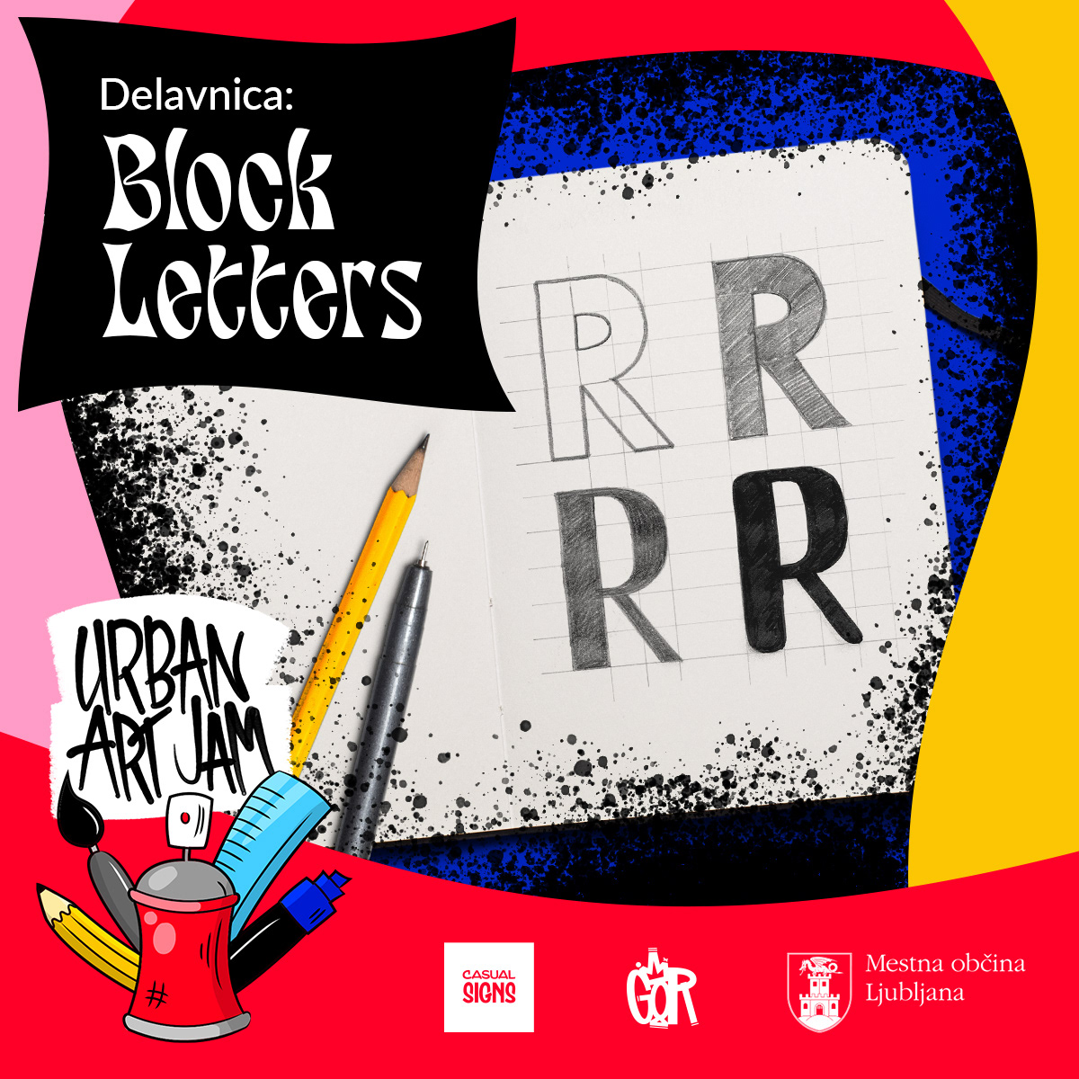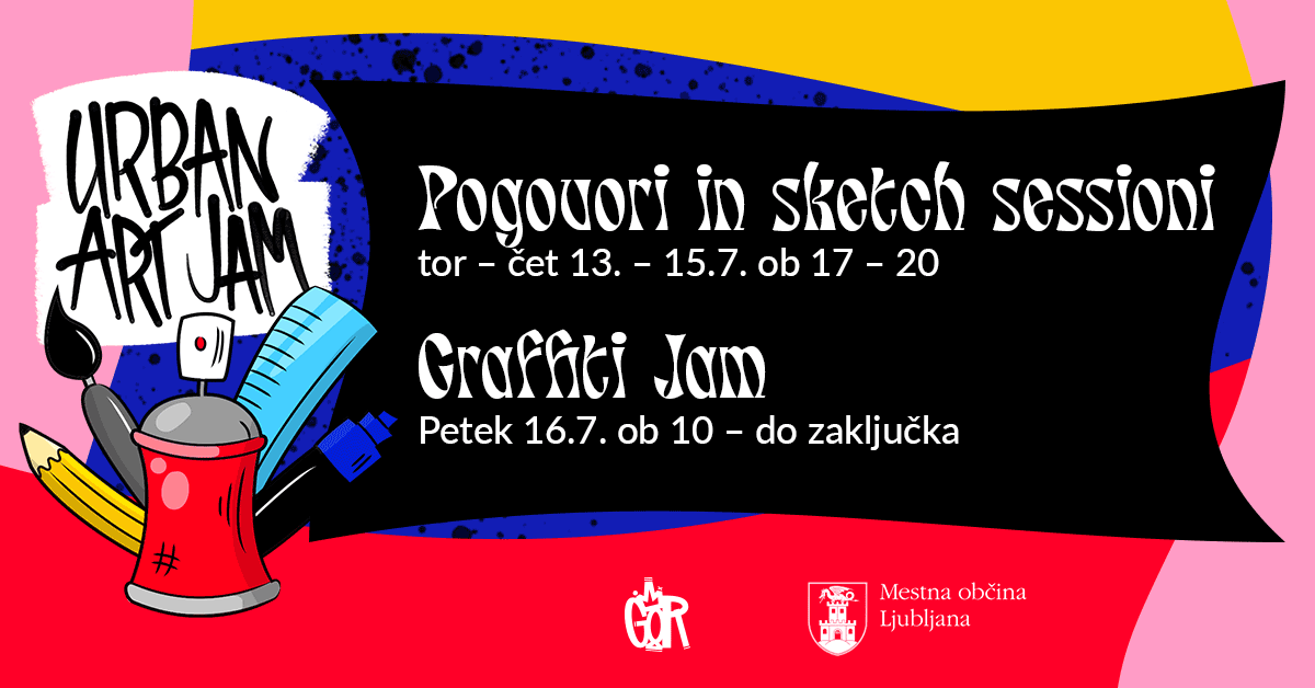 Digitally illustrated logo and lettering and all the social media promotion materials for Urban Art Jam—a series of art workshops and a graffiti jam for youth and teenagers with a range of different mentors in Ljubljana, Slovenia.